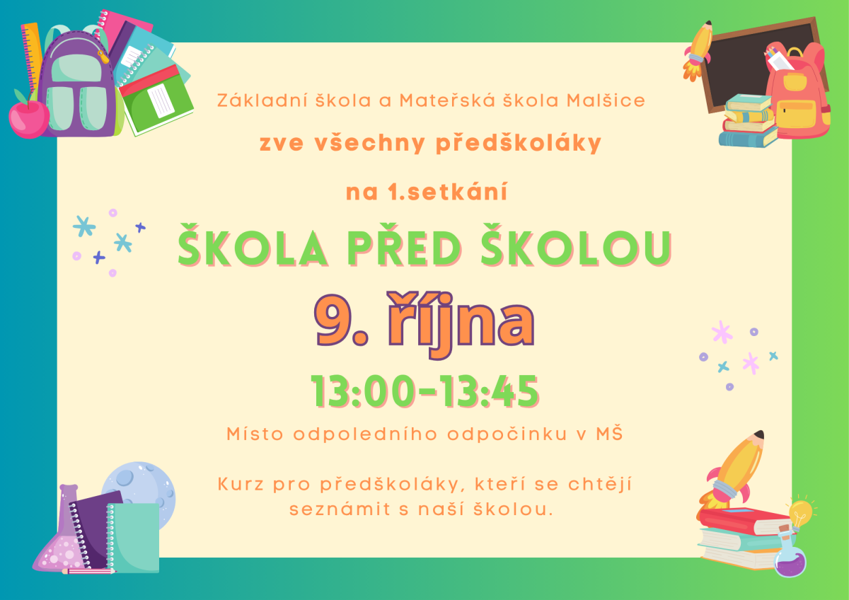 Od 9.října začínáme již s třetím ročníkem Školy před školou. Jedná se o deset krátkých setkání dětí v posledním ročníku předškolního vzdělávání s učiteli 1. stupně ZŠ. Děti se postupně seznamují s prostředím ZŠ, objevují nové technologie, získávají kontakt s novými učiteli a ztrácí prvotní ostych, který jim může bránit v komunikaci v novém prostředí při ostrém vstupu do ZŠ.