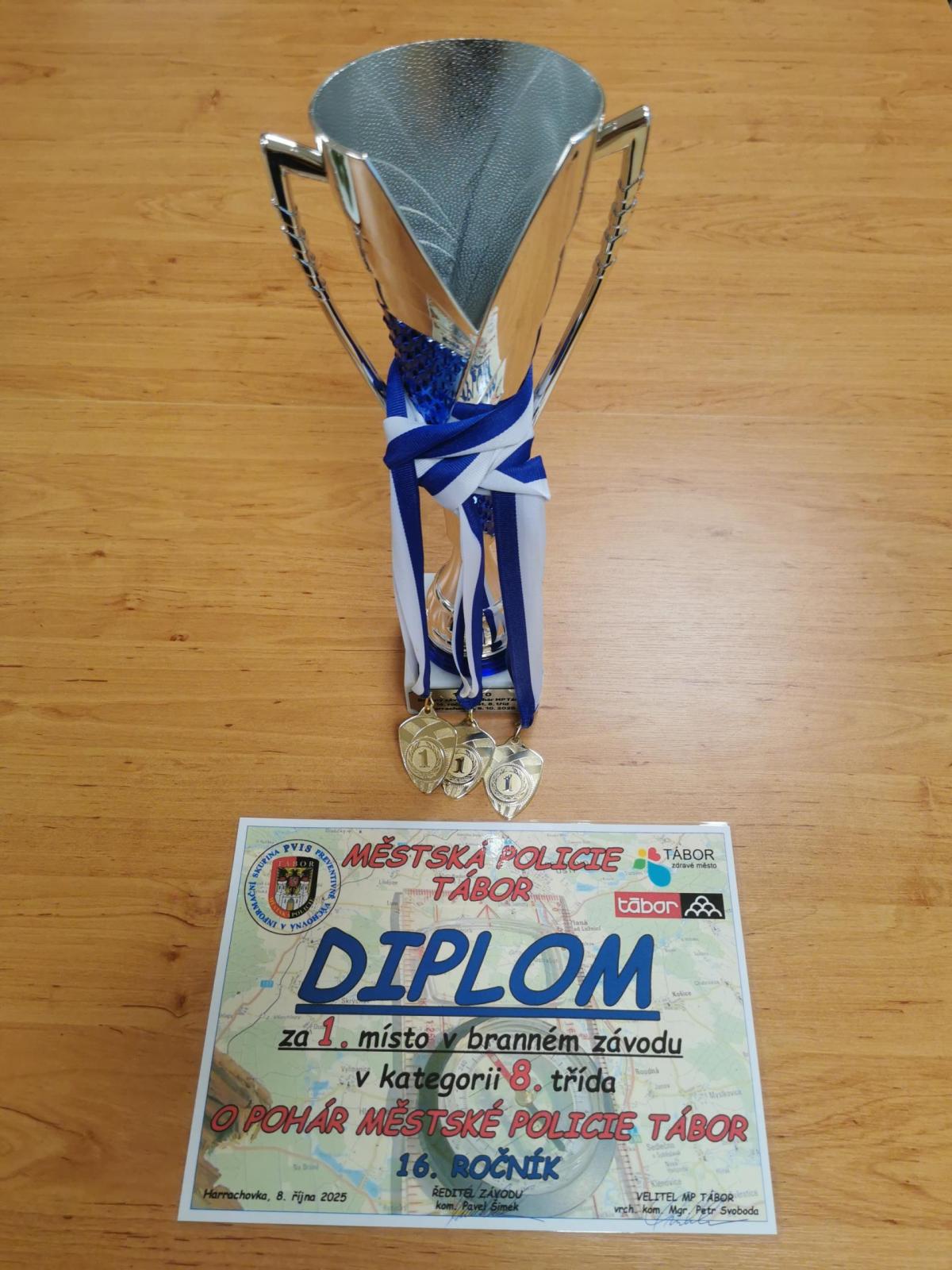 Velká gratulace patří družstvu z naší 8. třídy, které vyhrálo 16. ročník branného závodu O pohár Městské policie Tábor. Dále naše družstva obsadila třetí a sedmé místo. Na náročné pětikilometrové trati se sedmi disciplínami bojovalo na Harrachovce o vítězství celkem 25 družstev základních škol z Tábora, Sezimova Ústí, Mladé Vožice a Malšic.