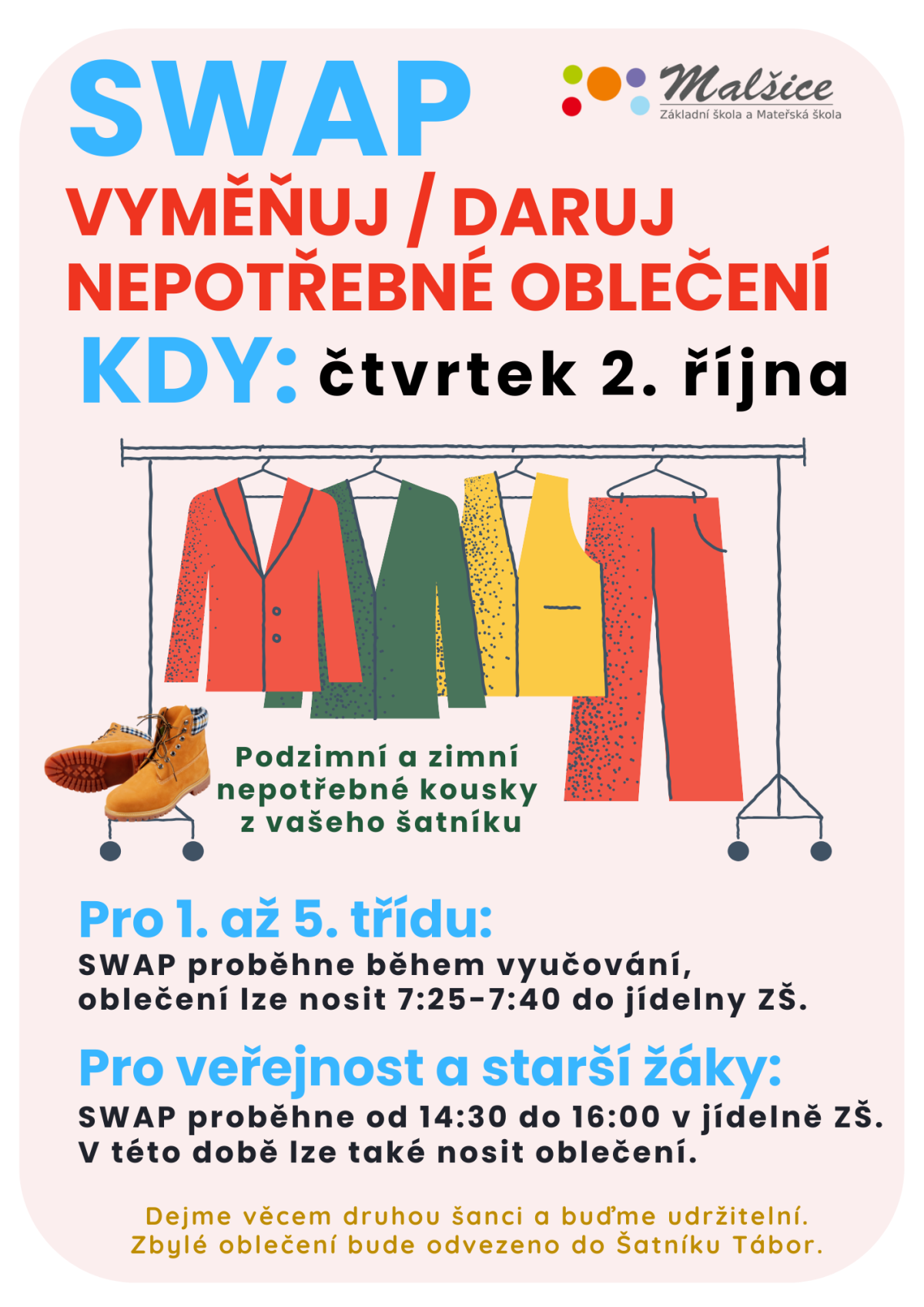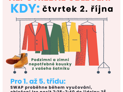 Naše škola uspořádala již druhý swap oblečení. Jsme rádi, že v dětech probouzíme myšlenku udržitelnosti a ukazujeme jim, že i věci, které už doma nepotřebujeme, mohou udělat radost někomu dalšímu. Zbylé oblečení odvezeme do Šatníku Tábor, kde ještě dobře poslouží těm, kteří ho potřebují.